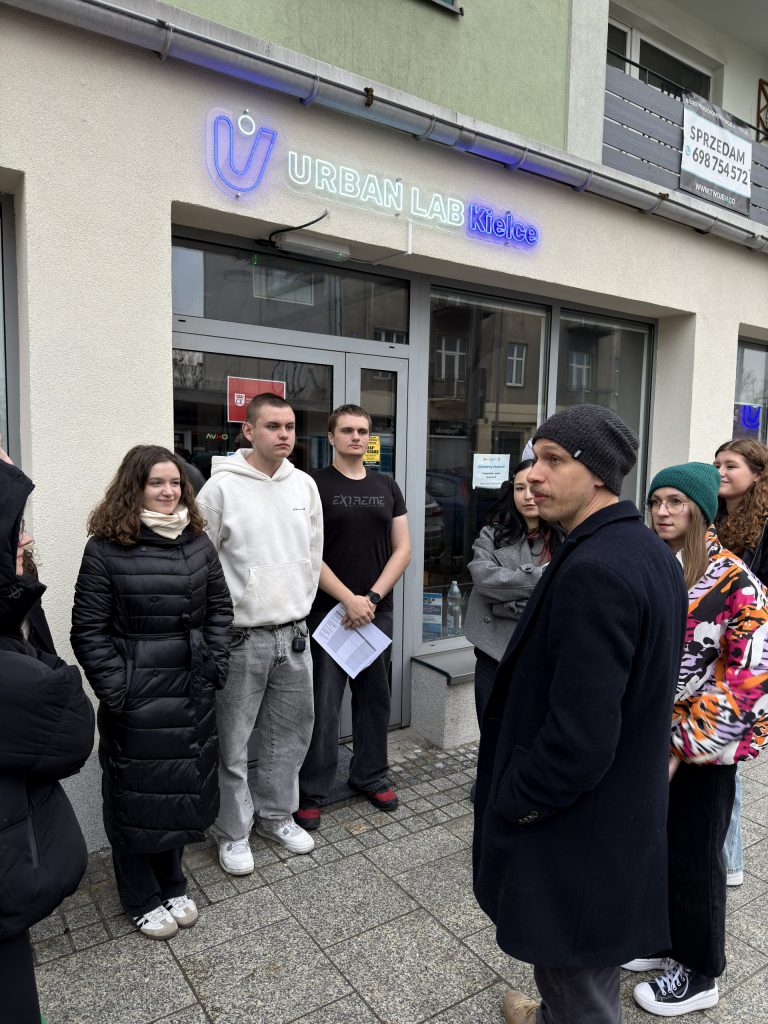 Zamiast długich prezentacji, postawiliśmy na praktykę. Wyszliśmy w teren i przyjrzeliśmy się przestrzeni przed kieleckim Urban Labem. Razem z uczestnikami analizowaliśmy: