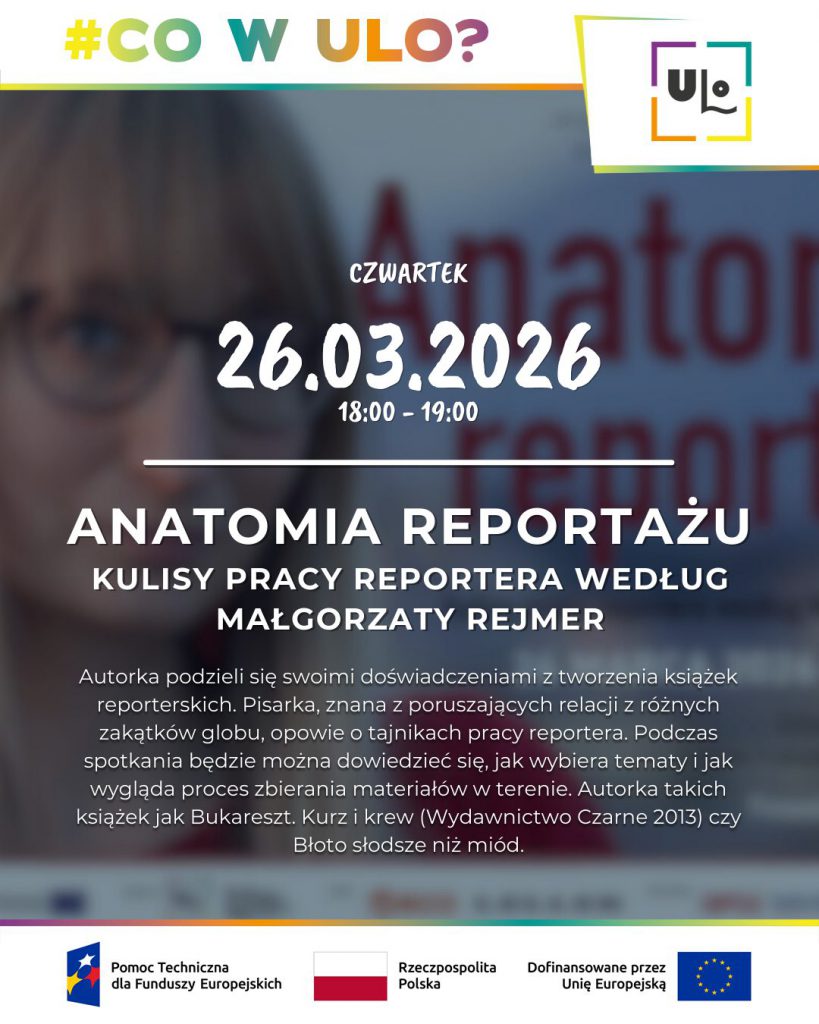 Zapraszamy na spotkanie z pisarką Małgorzatą Rejmer, które odbędzie się w ramach cyklu Patryk Szymański: Mapy reportażu. W trakcie wydarzenia polska autorka podzieli się swoimi doświadczeniami z tworzenia książek reporterskich. Pisarka, znana z poruszających relacji z różnych zakątków globu, opowie o tajnikach pracy reportera. Podczas spotkania będzie można dowiedzieć się, jak wybiera tematy i jak wygląda proces zbierania materiałów w terenie. Autorka takich książek jak „Bukareszt. Kurz i krew” (Wydawnictwo Czarne 2013) czy „Błoto słodsze niż miód. Głosy komunistycznej Albanii” (Wydawnictwo Czarne 2018), opowie, jak powstały jej reportaże i jak wygląda warsztat reportera.